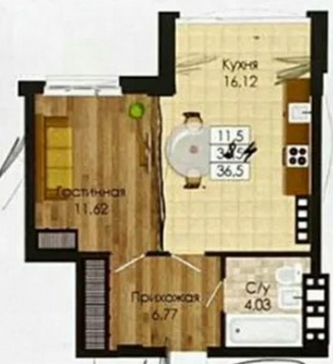 - Площадь: 36/12/16 м²