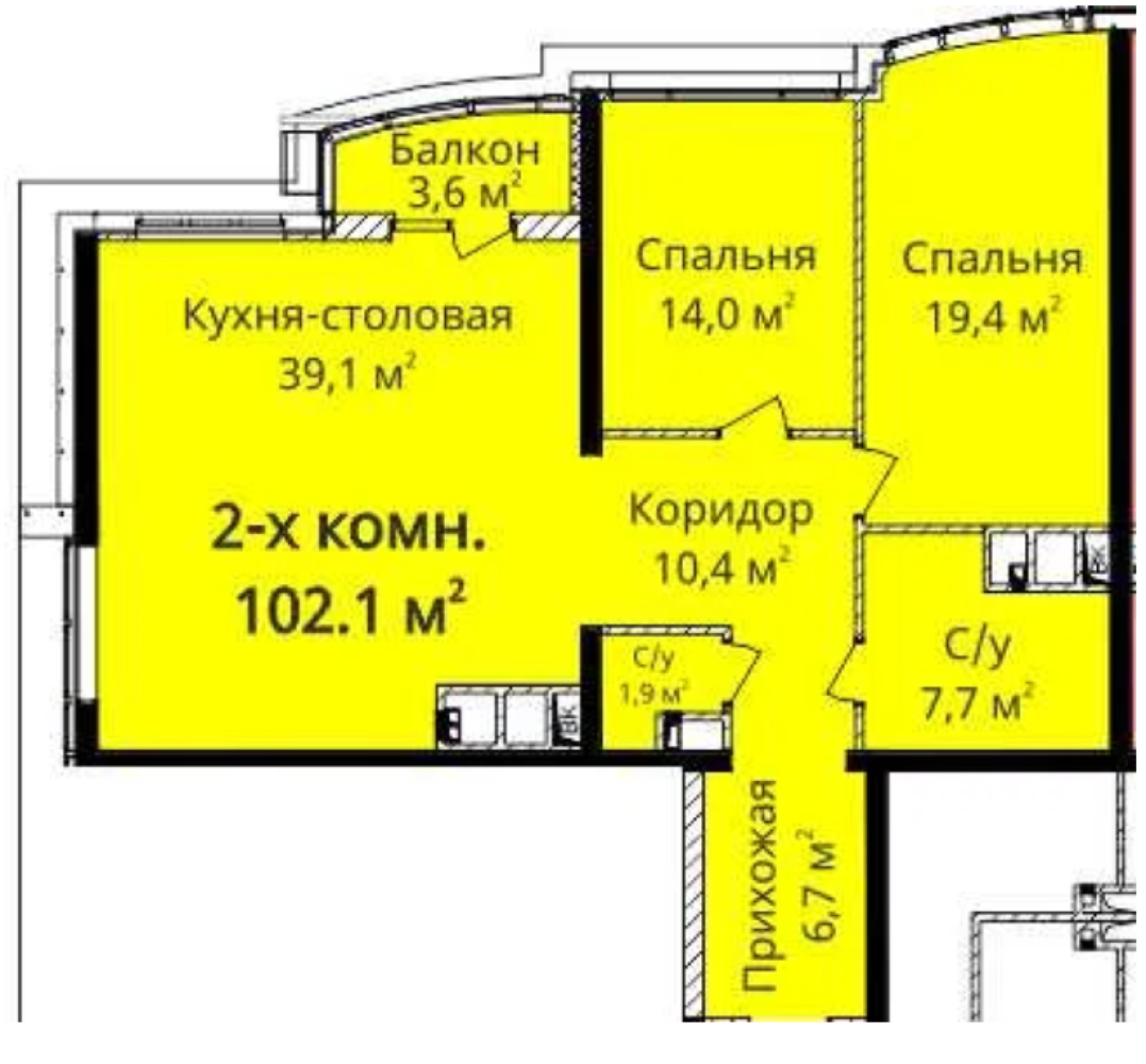 - Площадь: 102/39 м²